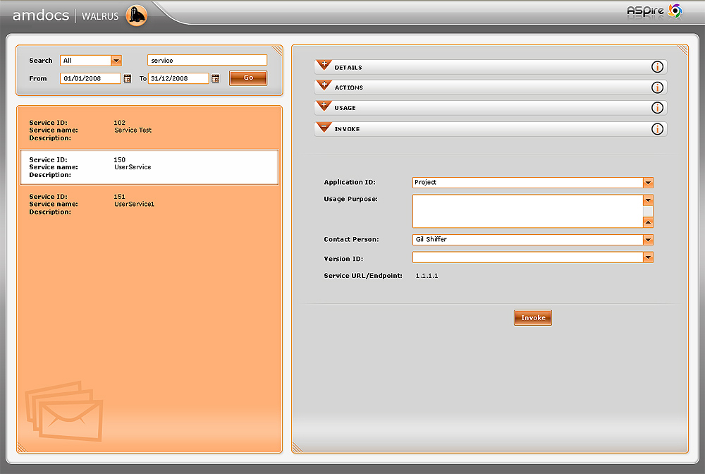 Walrus is Amdocs ASPire’s module for managing a service catalog. Walrus allows users to upload new services and manage service versions and displays an advanced search screen, allowing users to search by service providers, categories, key words, policies and more.